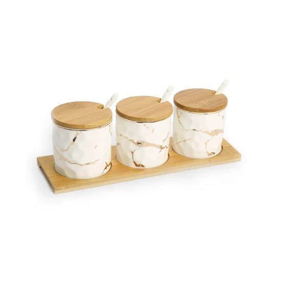 This porcelain canister set features an all-over gold-tone marble design with wooden lids and tray. It includes spoons to make the servings easier. This set can work beautifully for any coffee table, serving table, or just any dining setting. Enjoy these petite canisters for multi use experience.