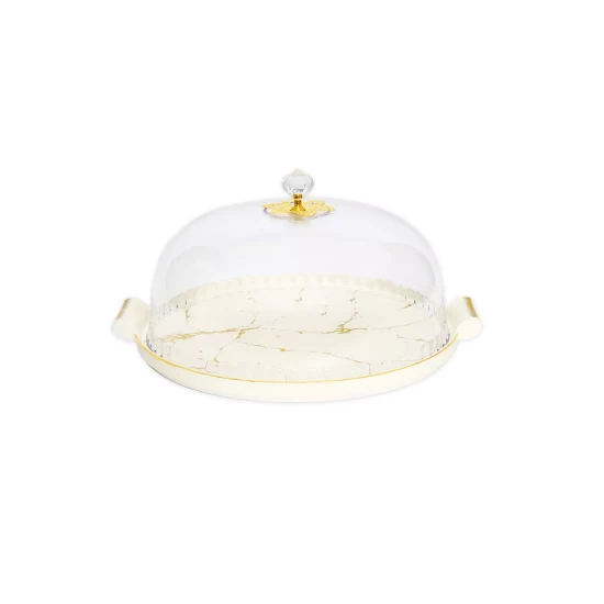 Impress your guest with a level of refinement and memorable cake and dessert serving experience. This cake dome set features a porcelain white base with an all-over gold-tone marble design. In addition, the clear Lucite cover will add that extra reflection to your presented cake or condiment.