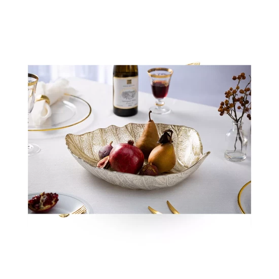 This gold tone leaf dish is artfully crafted by detailed designers. We chose the leaf shape for its practical size and nature oriented design. This dish is so beautiful that it can be enjoyed as a centerpiece without placing anything on it.