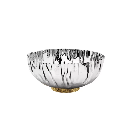 Crafted with quality stainless steel, this crumpled designed bowl is useful as a serving or salad bowl. It features a lustrous finish which gives the bowl and elegant, slightly mirrored shine. This bowl is designed with a deep interior and encompassing walls.