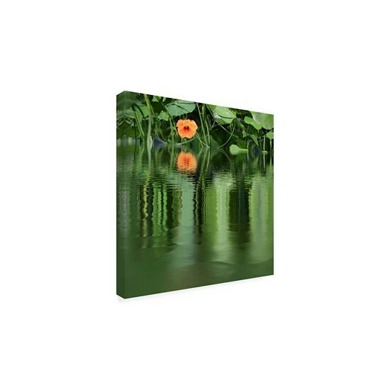 This ready to hang, gallery-wrapped art piece features a close up distorted photograph of lily pads and blossom on a pond. Gallery-wrap is a method of wrapping an artist’s canvas around a hidden, wooden frame allowing for a frameless presentation.